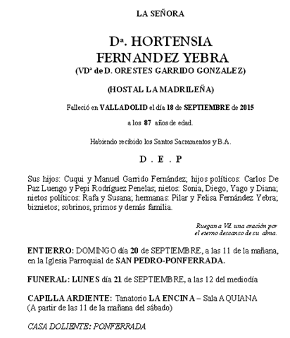 Nos dejó HORTENSIA FERNANDEZ YEBRA, nos dejó a los 87 años . Por AF2Toral en 19 septiembre, 2015 • ( 1 comentario ) HORTENSIA FERNANDEZ YEBRA, a los 87 años ( hermana de Pilar y Felisa ) Comparte esto: Comparte en Facebook (Se abre en una ventana nueva) Facebook Compartir en WhatsApp (Se abre en una ventana nueva) WhatsApp Más Compartir en Instagram (Se abre en una ventana nueva) Instagram Me gusta esto:Me gusta Cargando... Categorías:Nos dejó