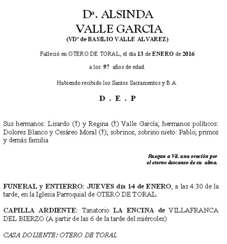 Nos dejó Alsinda Valle García nos dejó , en Otero , a los 97 años By AF2Toral on 13 enero, 2016 • ( Leave a comment ) Comparte esto: Comparte en Facebook (Se abre en una ventana nueva) Facebook Compartir en WhatsApp (Se abre en una ventana nueva) WhatsApp Más Compartir en Instagram (Se abre en una ventana nueva) Instagram Me gusta esto:Me gusta Cargando... Categories: Nos dejó
