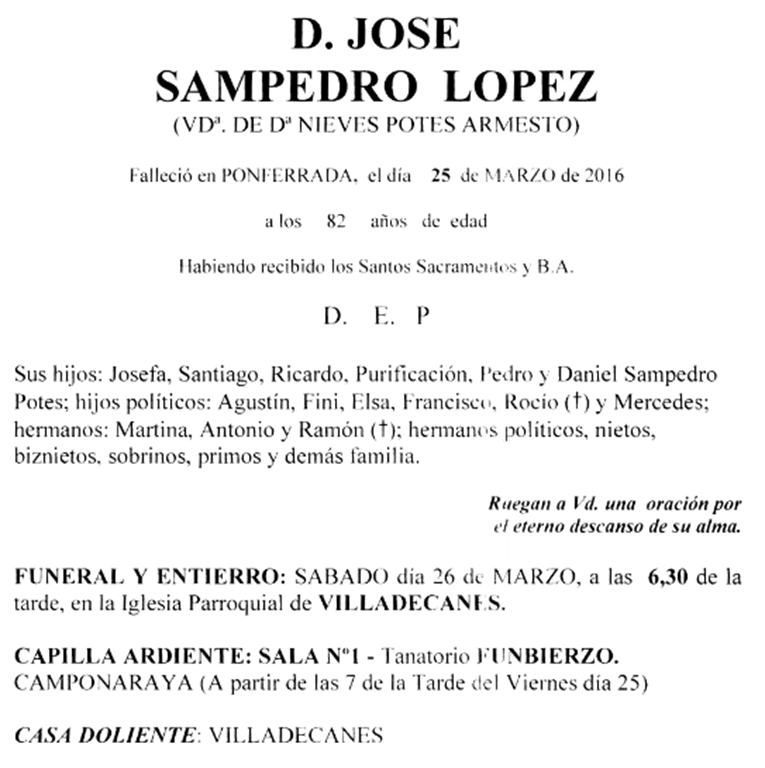 Nos dejó José Sampedro López , nos dejó en Villadecanes a los 82 años By AF2Toral on 25 marzo, 2016 • ( 2 Comments ) Comparte esto: Comparte en Facebook (Se abre en una ventana nueva) Facebook Compartir en WhatsApp (Se abre en una ventana nueva) WhatsApp Más Compartir en Instagram (Se abre en una ventana nueva) Instagram Me gusta esto:Me gusta Cargando... Categories: Nos dejó