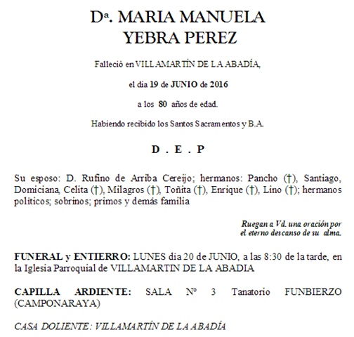 Nos dejó María Manuela Yebra Pérez , nos dejó en Villamartin a los 80 años. By AF2Toral on 20 junio, 2016 • ( 1 Comment ) ( Mujer Rufino el zapatero ) Comparte esto: Comparte en Facebook (Se abre en una ventana nueva) Facebook Compartir en WhatsApp (Se abre en una ventana nueva) WhatsApp Más Compartir en Instagram (Se abre en una ventana nueva) Instagram Me gusta esto:Me gusta Cargando... Categories: Nos dejó
