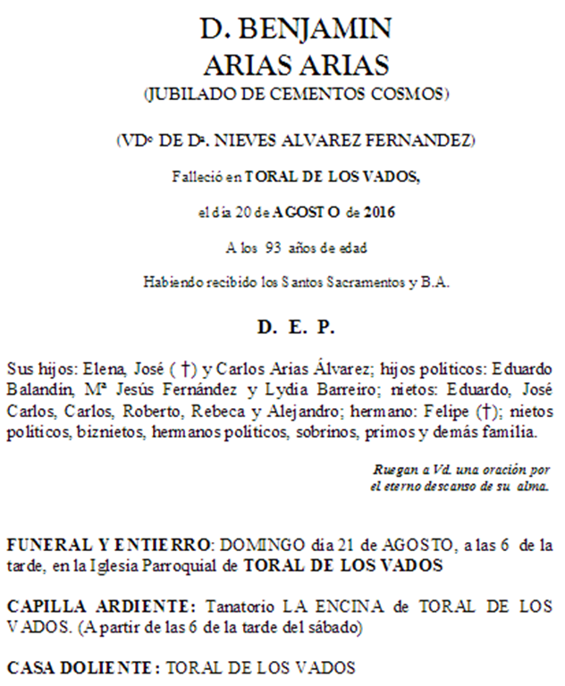 Una vez conté a mi grupo de amigos, cuando me reprocharon que pagaba con demasiada frecuencia, que lo hacía porque quería parecerme a un hombre cordial y generoso del pueblo de mi padre que mostraba el cariño que nos tenía, además de interesándose por todo lo nuestro, invitando siempre: desde entonces siempre que pago me dicen «Ya está el Benjamín» y yo sonrió. En adelante la sonrisa será un poco más amarga pero será porque sonriente enfrentabas tú la vida. Descansa en paz y hasta siempre, Benjamín!