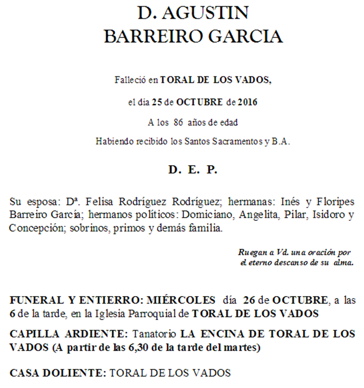 Nos dejó Agustín Barreiro García , nos dejó , a los 86 años By AF2Toral on 25 octubre, 2016 • ( Leave a comment ) Comparte esto: Comparte en Facebook (Se abre en una ventana nueva) Facebook Compartir en WhatsApp (Se abre en una ventana nueva) WhatsApp Más Compartir en Instagram (Se abre en una ventana nueva) Instagram Me gusta esto:Me gusta Cargando... Categories: Nos dejó
