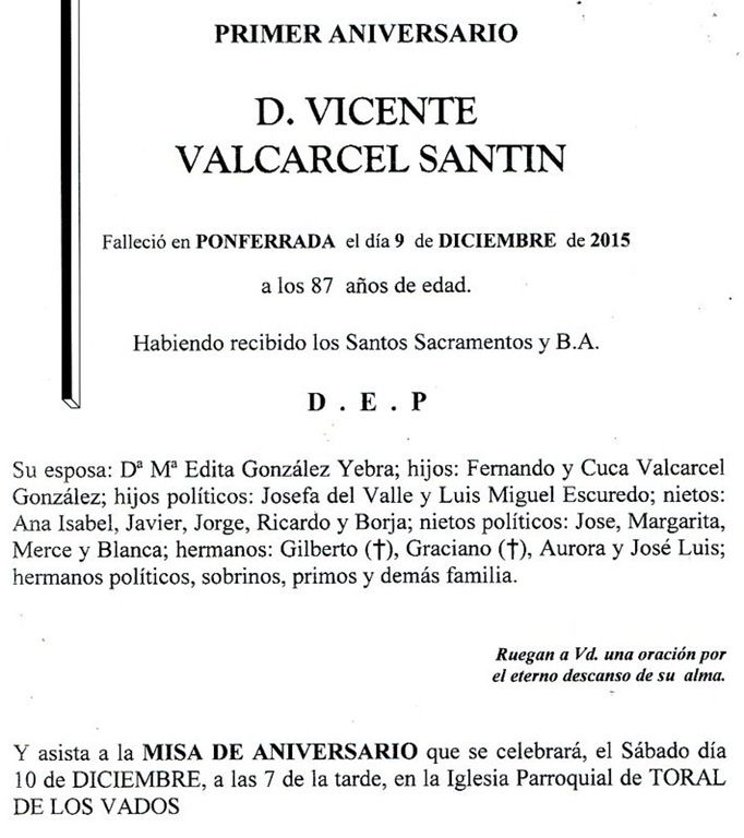 Nos dejó Primer aniversario, Vicente Valcarcel Santín By AF2Toral on 5 diciembre, 2016 • ( Leave a comment ) Comparte esto: Comparte en Facebook (Se abre en una ventana nueva) Facebook Compartir en WhatsApp (Se abre en una ventana nueva) WhatsApp Más Compartir en Instagram (Se abre en una ventana nueva) Instagram Me gusta esto:Me gusta Cargando... Categories: Nos dejó