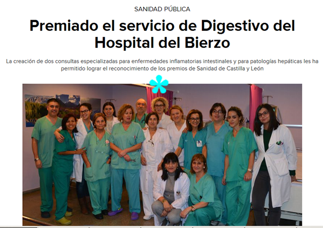 La coterránea , junto con el equipo de la Unidad de Digestivo del Hospital del Bierzo,han sido reconocidos por la Sanidad de Castilla y León a causa de la creación de dos consultas especializadas para enfermedades inflamatorias intestinales y para patologías hepáticas.