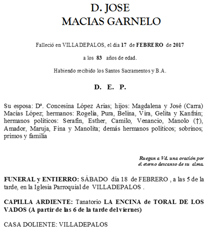 Nos dejó JOSE MACIAS GARNELO, nos dejó en Villadepalos a los 83 años Por AF2Toral en 17 febrero, 2017 • ( Deja un comentario ) Comparte esto: Comparte en Facebook (Se abre en una ventana nueva) Facebook Compartir en WhatsApp (Se abre en una ventana nueva) WhatsApp Más Compartir en Instagram (Se abre en una ventana nueva) Instagram Me gusta esto:Me gusta Cargando... Categorías:Nos dejó