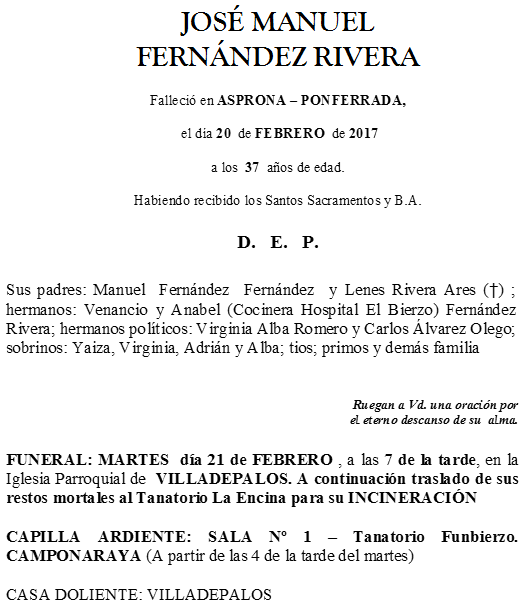 Nos dejó José Manuel Fernández Rivera, nos dejó en Villadepalos , a los 37 años By AF2Toral on 20 febrero, 2017 • ( Leave a comment ) Comparte esto: Comparte en Facebook (Se abre en una ventana nueva) Facebook Compartir en WhatsApp (Se abre en una ventana nueva) WhatsApp Más Compartir en Instagram (Se abre en una ventana nueva) Instagram Me gusta esto:Me gusta Cargando... Categories: Nos dejó