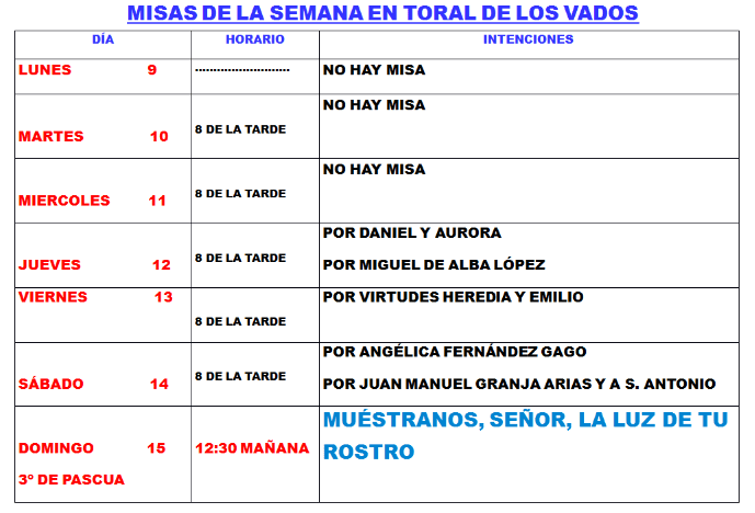 Cosas de la Iglesia Misas semana 15 By AF2Toral on 8 abril, 2018 • ( Leave a comment ) Comparte esto: Comparte en Facebook (Se abre en una ventana nueva) Facebook Compartir en WhatsApp (Se abre en una ventana nueva) WhatsApp Más Compartir en Instagram (Se abre en una ventana nueva) Instagram Me gusta esto:Me gusta Cargando... Categories: Cosas de la Iglesia