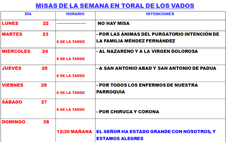 Cosas de la Iglesia Misas semana 29 By AF2Toral on 23 octubre, 2018 • ( Leave a comment ) Comparte esto: Comparte en Facebook (Se abre en una ventana nueva) Facebook Compartir en WhatsApp (Se abre en una ventana nueva) WhatsApp Más Compartir en Instagram (Se abre en una ventana nueva) Instagram Me gusta esto:Me gusta Cargando... Categories: Cosas de la Iglesia