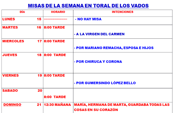 Cosas de la Iglesia Misas semana 29 Por AF2Toral en 14 julio, 2019 • ( Deja un comentario ) Comparte esto: Comparte en Facebook (Se abre en una ventana nueva) Facebook Compartir en WhatsApp (Se abre en una ventana nueva) WhatsApp Más Compartir en Instagram (Se abre en una ventana nueva) Instagram Me gusta esto:Me gusta Cargando... Categorías:Cosas de la Iglesia