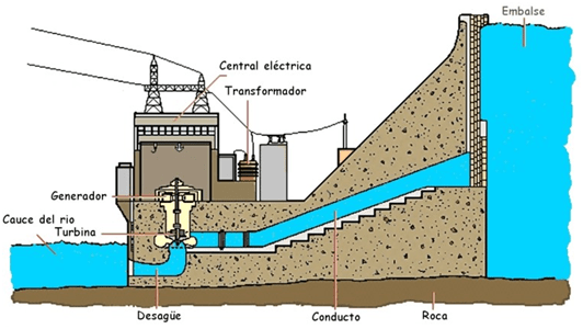 Para conseguir el objetivo de transformación energética se hace circular un caudal de agua por un circuito hidráulico que salva el desnivel entre las dos altitudes, el salto, y en el que el agua va adquiriendo más velocidad a medida que la energía potencial se va transformado parcialmente en energía cinética. La turbina de la central es la encargada de transformar esa energía cinética en energía mecánica, que el generador transformará a su vez en energía eléctrica.