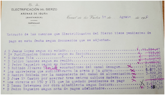 El 31 de julio de 1930 el presidente de Electrificación del Bierzo escribió a una carta a Luis Guibelalde de la que destacamos lo siguiente: “le suplico que me envíe con toda premura un detalle de la cuenta que tenemos con el Sr. López, con su padre político, con los carreteros y con todos aquellos que Vd. considera acreedores nuestros”. La información enviada por Luis Guibelalde se refleja en el extracto de cuentas acreedoras de Electrificación del Bierzo siguiente:
